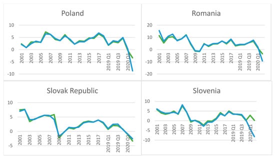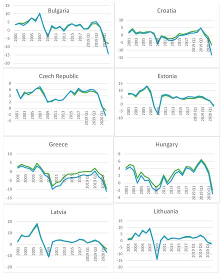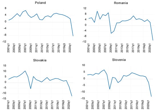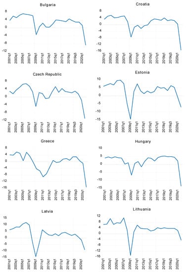 First step, we move to a brief graphical overview of the level of the dependent variable (Economic growth) of the countries of Central and Eastern Europe for the period 2000–2020Q2. According to Figure 1, we can see a similar trend for all countries analysed. A significant decrease is observed in the crisis years, 2008–2009. The same major downward trends are also recorded for the first two quarters of 2020 with an ongoing economic crisis. For 2008–2009 the lowest values are recorded by Latvia, Lithuania, and Estonia. Higher values for 2009 were maintained by Poland, Bulgaria, and the Czech Republic, and in the second quarter of 2020, Lithuania, Estonia, and Bulgaria are better than the other countries but are still negative (−4.2 for Lithuania, −6.9 for Estonia, and −8.7 for Bulgaria). Economic growth depends on the characteristics of the country, the conditions of the financial market, the behaviour of governments, private agents, the population, and the multiple functions of growth.