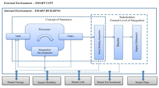 In all cases, it is recommended to follow a certain coherent plan moving from one development stage to another. The theoretical model of smart building integration into a smart city (SBISC) adopted for real estate development is presented in Figure 1.