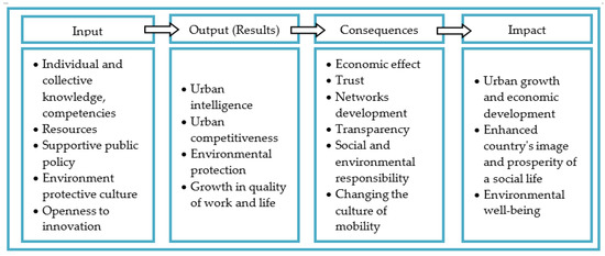 The above described input indicators generate direct output results such as urban intelligence and competitiveness, increase of environmental protection, and life quality. On a bigger scale, these results lead to more sophisticated consequences: trustful and transparent government and society, social and environmental responsibility, network development both for city infrastructure and local communities, changes in the culture of the mobility, and stimulation of economic activities. Finally, the obvious impact is made on the main sustainability areas: urban growth and economic development, prosperity of a social life, and enhanced country image, as well as environmental well-being (Figure 2).
