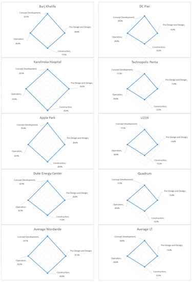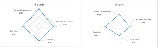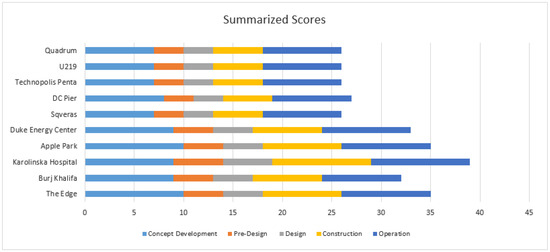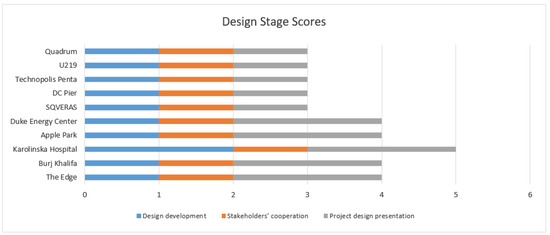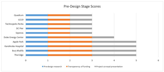 As can be seen from Figure 5, the majority of the foreign projects demonstrated the highest evaluation results in pre-design studies and the transparency of funding. For example, the construction of new buildings might cross the existing pathways of wild animals, birds or insects. The designers of The Edge—a smart building in Amsterdam—researched the path of bees and other beneficial insects and their need for urban vegetation and installed appropriate spaces. Duke Energy Center’s initial pre-design ideas on sustainability and smartness were upgraded during the detailed design and construction phase.