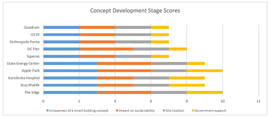 In total, four criteria are considered when evaluating the project concept development stage: uniqueness of a smart building concept, impact on sustainability, selection of a project site location, and government support. The available cumulative maximum score for the concept development stage is 10 points (Table 3).