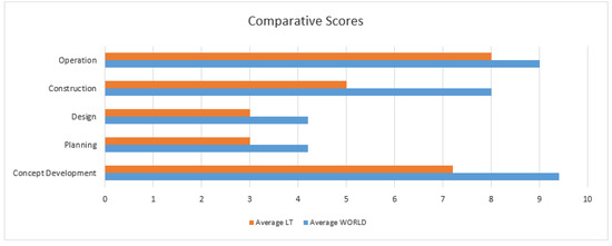 Meanwhile, real estate project development stages of Lithuanian projects achieved lower average ratings (Figure 10). It can be assumed that both Lithuanian cities and real estate developers are not yet inclined to take the lead and go beyond the established performance standards in terms of smart building and smart city interoperability. Innovation progress of Lithuania in comparison to the world-wide renowned real estate project development and integration into the smart city systems practices is still evolving gradually.