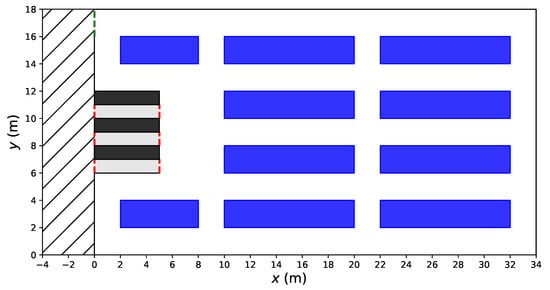 The checkout area includes three counters (in black) and three corridors (in gray), while the shopping area includes 10 goods shelves. The sizes of the far left two shelves are and the sizes of other shelves are . Except the area in front of the checkout area, the widths of the walking paths are 2 m. The entrance is located in the upper left corner of the supermarket (green dashed segments). The exits from the shopping area to the checkout area and the exits from checkout area to outside are all marked with red dash segments.