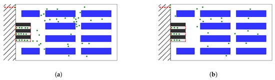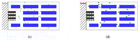 To explore if the measures taken by the supermarkets are efficient in reducing the contact among customers, the simulations are implemented in the geometry shown in Figure 2 with four different scenarios. For all cases, we use the following parameter values in Table 1. We assumed reasonable values for the desired moving speeds and the shopping times of customers, which are normally distributed for heterogeneity. The mean and standard deviation of the desired moving speeds refer to the free walking speed of pedestrians [,]. The other values in Table 1 are kept constant to guarantee the justification of the comparisons between different scenarios.