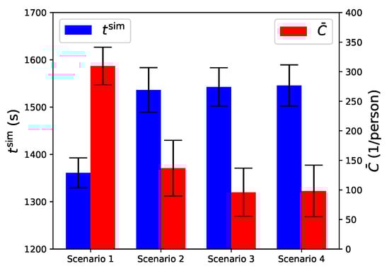 The simulations of this work are performed using JuPedSim [], which is an open framework for simulating and analyzing the dynamics of pedestrians. The simulations are executed on a standard computer (Inter(R) Core(TM) CPU of 2.50 GHZ) with Euler scheme using a time step s. The update of the customers is parallel in each time-step. We run simulations in each scenario for 30 times. Then, we calculated the mean value and standard deviation of and , which are shown in Figure 4.