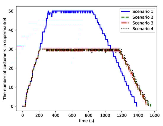 The snapshots of each scenario are shown in Figure 3. The customers are represented by circles with r = 0.2 m in scenarios 1, 2, and 3, where customers can enter the supermarket without a shopping cart. In scenario 4, customers enter the supermarket with shopping carts, therefore they are represented by ellipses with semi-axes m and m. Customers inside the supermarket are in green whereas customers outside are in red.