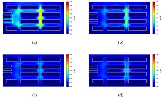 where G is the set containing all the customers in the grid. We calculate the mean value of in each grid with the 30 times simulations of each scenario. The distributions of in the supermarket for four scenarios are shown in Figure 6.
