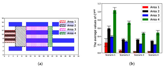The four profiles in Figure 6 also show that the values of differ depending on different parts of the supermarket. Therefore, in Figure 7a four areas in the supermarket are specified, and the average values of in these areas are calculated. The grids which are located in the obstacles (e.g., counters and goods shelves) are ignored in the calculation, as the values of in the obstacle areas are always equal to zero. The mean values and standard deviations of 30 times simulations for four scenarios are compared in Figure 7b.