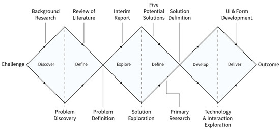 The Double-Diamond Model for innovation and design development [20] was deemed an appropriate methodology for the design of the conceptual solution. The first half of the model focuses on discovery and definition of the problem and context. Hence, this model was used, although during the second half of the model it was discovered that there was another narrowing stage. The authors coined this “The Triple Diamond Model”, as illustrated in Figure 1, which contains notable project stages. This is similar to the Double-Diamond Model, as it does state that the diamonds can and should be repeated iteratively, but in the context of this research, the triple variation illustrates the process more clearly.