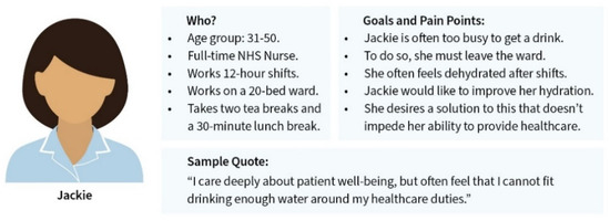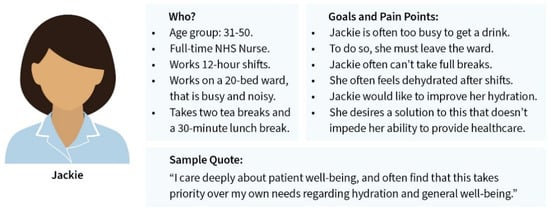 Before choosing appropriate method(s) for investigating the problems experienced by nurses, the first author viewed and analyzed the documentary “The Big Hospital Experiment” [21], which details the testing of a volunteer healthcare assistant program, covering many of the usual duties that nurses undertake. This was used to learn more about contextual factors that might influence hydration behaviors in hospital ward environments, and to reinforce the authors’ understanding of ward-based nursing. Hand-written notes were taken during the documenting process, focusing on the general daily routines of nurses, the activities they undertake and how and when breaks were taken. After analyzing the notes taken, a user persona for nurses operating on NHS wards (Figure 2) was developed to provide inspiration and guidance for design decisions, which gave an understanding of the ward environment and nurses’ responsibilities. Further insights were taken from a Royal College of Nursing report on Hydration in Nursing [22]. The Nursing and Midwifery Council registry data [23], on the profile of its members, were also consulted to help define the user group; however, this did not include data from private organizations, midwives and nursing associates. The persona was created using recommendations made by Van Boeijen et al. [24] and based on the personas used by Alzahrani and Alnanih [18].