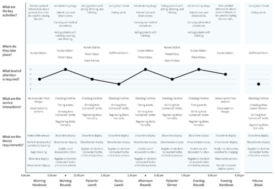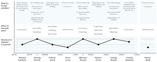 Following analysis of interview and observational data, a new nurse user persona was created (Figure 4). Alongside this, a user journey was created, as shown in Figure 5, using insights from both primary and secondary research. Creating the persona and user journey allowed for the visualization of the insights gained and aided in identifying and understanding the environmental and contextual factors surrounding the problem—something stated as essential by Fernandez et al. [6]. This was based on a 12.5-h shift—the longest period a BCI would be required to operate. The “required attention” category is based on the first author’s perception of the tasks that are completed, using a relative scale. It has been included as reducing extraneous cognitive loading reduces the attention spent [26], which reduces error occurrence due to attentional narrowing and distraction [27]. Adding distractions in a safety critical environment could lead to injury; thus, interactions with the solution were designed around the available attention.