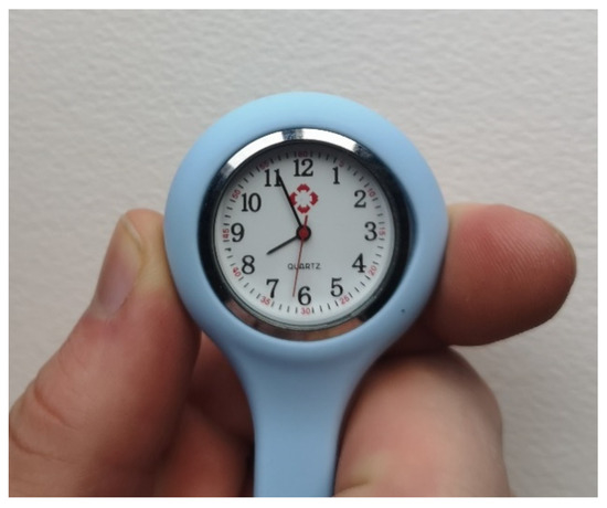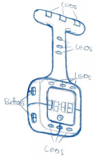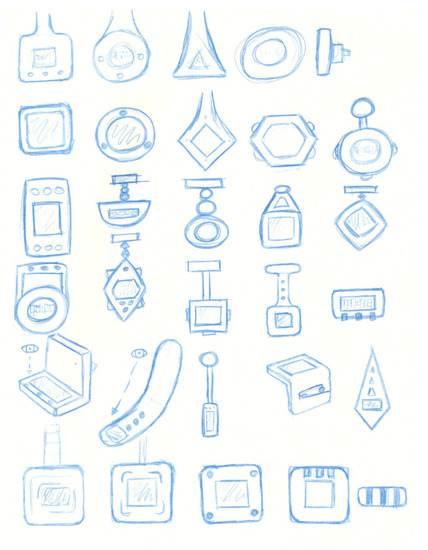 Forms were ideated using thumbnail sketches on paper, as shown in Figure 8. The form covers three key elements: overall shape, how the device is attached to clothing and how nurses identify the correct watch at the start of a shift. Many different forms were considered, including a device that would attach onto a fob watch, but this was discounted due to infection control reasons. Fob watches are available in several variations, such as in silicone housings, attached to a metal chain, or attached to a clip. The silicone and chain watches use a lockable safety pin to attach to clothing, with the silicone watch being more common during the observation study at Guy’s Hospital, possibly due to its ease of cleaning, clinical appearance and low price. For these reasons, a silicone housing style solution was chosen, ensuring user familiarity with the device. Two main forms were identified—circular or a rounded square. The rounded square was chosen, as the authors found it difficult to apply pressure to a circular silicone watch (Figure 9) as though buttons were being pressed.
