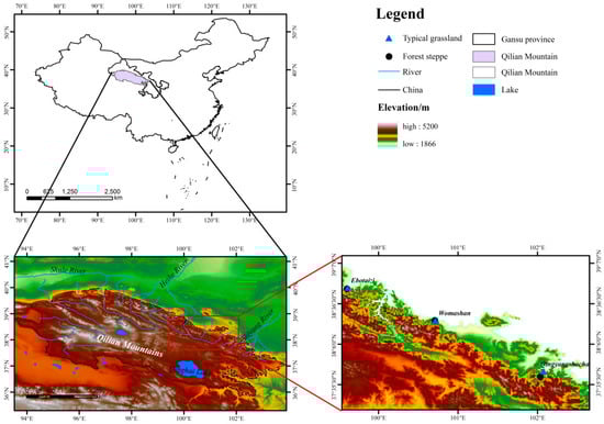 The study was carried out in the Qilian Mountains (Figure 1), that is situated in the northeast of Qinghai-Tibetan Plateau, and crosses Qinghai and Gansu provinces in China, and borders Hexi Corridor in the north, Qaidam Basin in the south, Wushaoling in the east and the Dangjin mountain pass in the west, and coordinates of about 35°43′ N to 39°36′ N latitude and 93°30′ E to 103°00′ E longitude. The Qilian Mountains are composed of several parallel mountains and wide valleys from northwest to southeast, of which the total length is about 1000 km and the maximum width is about 300 km [32]. Affected by the alpine climate of Qinghai-Tibetan Plateau and the arid climate of northwest China, the Qilian Mountains have typical characteristics of both a continental climate and plateau climate. The annual temperature is below 4 °C, and the annual precipitation is concentrated in May to September and varies between 400 to 700 mm. Because of complex natural geographical conditions, the vegetation of the Qilian Mountains has various types, and it has obvious vertical zonality. From low to high altitude, the vegetation types are in turn desert steppe, typical grassland, forest steppe, alpine shrub meadow vegetation, and alpine cold desert meadow; correspondingly the soil types are in turn mountain calcareous soil, mountain chestnut soil, forest gray cinnamon soil, alpine shrub meadow soil, and alpine cold desert soil [33].