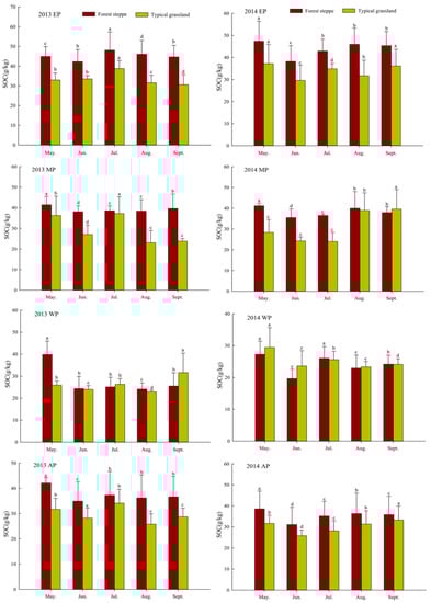 As shown in Figure 2, the contents of SOC of forest steppe and typical grassland at the EP in 2013 reached maximum values on July, which were 48.10 g/kg and 38.75 g/kg, respectively. While in 2014, the maximum values of SOC of them appeared on May, which were 47.4 g/kg and 37.17 g/kg, respectively. At the MP, the SOC content of forest steppe was higher than that of typical grassland. Contrary to forest steppe, the distribution of SOC of typical grassland was unstable; the maximum value reached 37.25 g/kg in July of 2013, but reached 39.59 g/kg in September of 2014. At the WP, the SOC content of typical grassland was higher than that of forest steppe in July and September of 2013 and in May, June and August of 2014, in which the contents of them were 36.32 g/kg, 31.66 g/kg, 29.40 g/kg, 23.61 g/kg and 23.33 g/kg, respectively. At the AP, the highest SOC values of forest steppe all occurred in May, which were 42.07 g/kg in 2013 and 38.60 g/kg in 2014, respectively. The highest SOC value of typical grassland was 34.11 g/kg in July of 2013, but that was 33.29 g/kg in September of 2014.