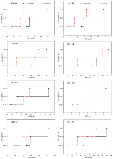 The SOC contents of forest steppe in 2013 were significantly different from the soil layer of 20–30 cm and soil layers of 0–10 cm or 10–20 cm (p < 0.05), but there were not significantly differences between each soil depth in 2014. Similar to this, the contents of SOC of typical grasslands in 2013 varied significantly in each soil layer (p < 0.05), and in 2014 showed significant differences from the soil layer of 0–10 cm and soil layers of 10–20 cm or 20–30 cm (p < 0.05). In two consecutive growing seasons, the SOC contents also showed strong differences among different grassland types. Comparing three sampling plots in the vertical profile, the most significant difference in SOC between them occurs at the MP. From 2013 to 2014, the SOC contents of forest steppe were higher than those of typical grassland, except for that at the WP in 2014.