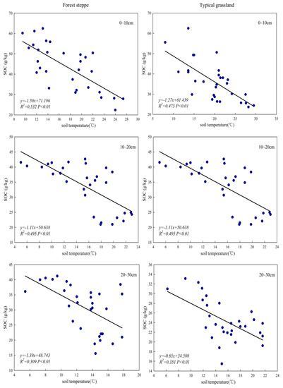 Relationship between SOC and soil temperature of different grassland types in different soil layers.