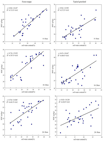 It can be seen from Figure 5 that SOC and soil water content of different grassland types in different soil layers on the northern slope of Qilian Mountains have a significant positive correlation (p < 0.01). In the soil layers of 0–10 cm, 10–20 cm and 20–30 cm, the correlation coefficients of SOC and soil water content in forest steppe are 0.846, 0.841 and 0.701, respectively, and those of typical grassland are 0.756, 0.699 and 0.592, respectively. In different soil layers, the correlations between SOC and soil water content of forest steppe are all higher than those of typical grassland. More soil water can prevent the decomposition of SOC, so the content of SOC is higher in the soil layer that has more soil water. Compared to typical grassland, the soil water in different soil layers is higher at forest steppe. Taking the soil layer of 0–10 cm and 10–20 cm as an example, the soil water contents of forest steppe are 28.28% and 22.74%, but that of typical grassland are 22.03% and 17.33%. In different soil layers, the contents of organic carbon are consistent with the contents of soil water. Changes in soil water conditions affect the accumulation and decomposition of organic matter. If the content of soil water increases, the aboveground vegetation and root biomass increase, and the decomposition rate of litter and roots accelerate [49], which has a certain impact on the accumulation of SOC. Therefore, there is a positive correlation between soil water and SOC. In each soil layer, the contents of SOC and soil water contents of forest steppe and typical grassland are significantly and positively correlated, which is consistent with the researches of Yang [50] in the Tibetan grassland of China and Fu [51] in the Alxa grassland of China.