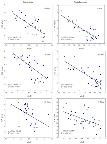 Soil acidity and alkalinity affect the presence, conversion and effectiveness of soil organic matter [54], and pH values that are too high (>8.5) or too low (<5.5) will inhibit the activity of microorganisms and reduce the decomposition SOC rate [33]. The soil of forest steppe and typical grassland on the northern slope of Qilian Mountains is alkaline (Figure 6). The value of soil pH of forest steppe varies between 7.6 and 9.9, and that of typical grassland varies between 7.2 and 8.9. There are significant negative correlations between SOC and the soil pH of forest steppe and typical grassland at different soil layers (p < 0.01), which is consistent with the researched results by Zhang Peng et al. [33]. The soil environment of the study area is generally alkaline, which inhibits the activity of microbes, and affects soil respiration and reduces the input of organic carbon [54]. In each soil layer of 0–10 cm, 10–20 cm and 20–30 cm, the correlation coefficients between SOC and soil pH of forest steppe are 0.745, 0.680 and 0.495, respectively, and those of typical grassland are 0.829, 0.764 and 0.510, respectively. As the soil layer deepens, the soil pH increases correspondingly.