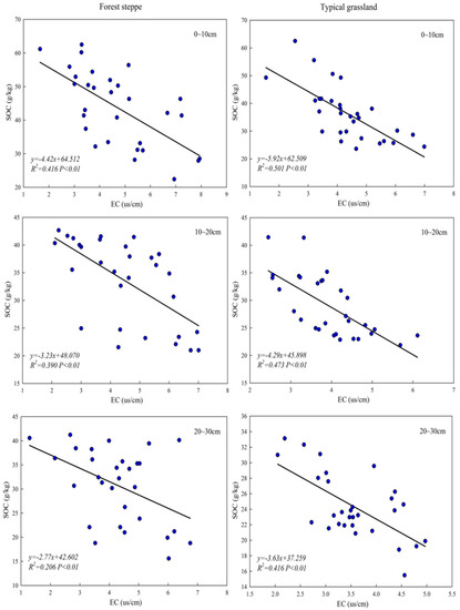 As can be seen from Figure 7, in different soil layers, SOC and soil electrical conductivity of forest steppe and typical grassland have significantly negative correlations (p < 0.01), which is consistent with the results of Feng Jin et al. [20]. The soil electrical conductivity reflects the state of soil salinity under certain water conditions. The soil electrical conductivity of forest steppe in soil layers of 0–10 cm and 20–30 cm concentrates on 2–6 us/cm, but in soil layers of 10–20 cm concentrate on 3 us/cm–5 us/cm. However, the soil electrical conductivity of typical grassland in soil layers of 0–10 cm and 20–30 cm concentrate on 3–5 us/cm, but in soil layer of 10–20 cm concentrates on 2–6 us/cm. In general, the correlations between SOC and soil electrical conductivity become weaker with the soil layer deepening.