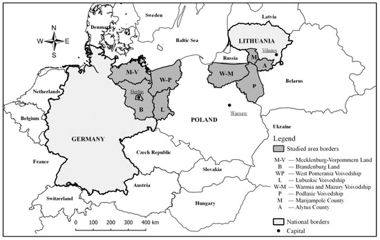 The study area is located in the European Union along Polish–German and Polish–Lithuanian borders and covered: German states—Brandenburg and Mecklenburg-Vorpommern; four Polish voivodeships—West Pomerania, Lubuskie (western Poland, bordering Germany), Warmia and Mazury, and Podlasie (eastern Poland, bordering Lithuania); and two Lithuanian counties—Marijampolė and Alytus (Figure 1).