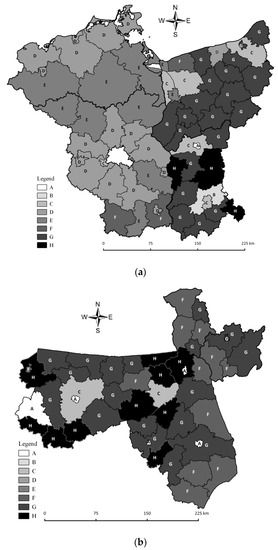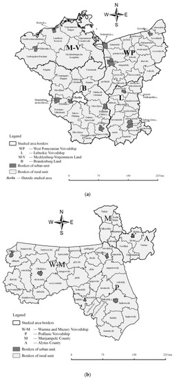 Both Polish–German and Polish–Lithuanian transborder regions are located in the Central European Plain, in the belt of the South Baltic Lake District (Polish–German) and the Eastern Baltic Lake District (Polish–Lithuanian) [51], which show high natural value and good predisposition for the development of agricultural and touristic functions. The following zones extend in Polish–German and Polish–Lithuanian transborder regions: a lowland zone, a young glacial zone with lively relief, well-defined lines of terminal moraines, outwash plains, numerous lakes and river ice-marginal valleys, and the zone of lake plateaus cut by broad outwash valleys. Within the plateaus, there is a flat and undulating ground moraine, made of glacial till and sandy loam formations. The Baltic coast zone additionally distinguishes Polish–German transborder regions with numerous beaches and chalk cliffs. In Polish–Lithuanian transborder regions, the regions of Warmia and Mazury and Podlasie are characterized by a very diverse landform, with a high share of forests and water bodies. Agricultural land occupies more than half of the region’s territory, and the local economy is based heavily on agriculture [26].