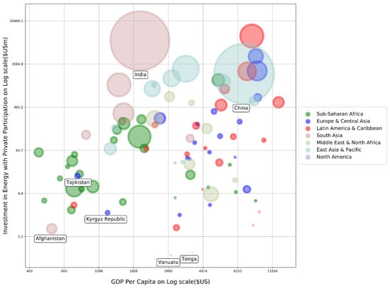 Average Private Participation in Energy Investment on log Scale between 2008–2018. Source: [,,].