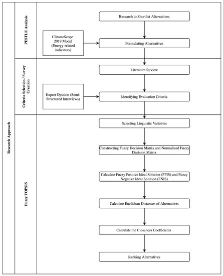 First, we conduct a PESTLE analysis to select 5 African countries as alternatives for a hypothetical renewable energy (RE) project investment. In social sciences PESTLE and its variants, such as the STEEP method, can be used to delineate the impact of macro-environmental factors on the performance of an investment decision [,]. We examine sixteen macroeconomic and microeconomics indicators, including value chains by clean energy sector, demand dynamics and policy-clean energy to corroborate the relevance of South Africa, Kenya, Nigeria, Cameroon and Tunisia, as ideal alternatives in the study. These countries are identified as leaders in regional indexes examining favorable location-specific characteristics for clean energy investments []. Second, the non-financial and financial drivers of investment decision-making are determined by the combined results of expert interviews and a theoretical analysis. We assign these drivers to evaluation criteria based on their economic, political, technical, environment or social aspects. Third, a fuzzy TOPSIS experiment is designed to obtain the order preferences of project attributes and preferred alternatives (countries) from a cohort of 49 investment professionals. Figure 3 outlines the research approach of the paper, which comprises three distinct stages.