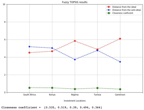 The closeness coefficients for each country are calculated as the final stage of the fuzzy TOPSIS analysis. Figure 4 plots the combined results of these outputs. Consequently, South Africa is identified as the preferred investment destination for renewable energy projects based on the survey responses and the evaluation criteria introduced in the study. Kenya ranked second, followed by Tunisia, Nigeria and Cameroon, respectively.