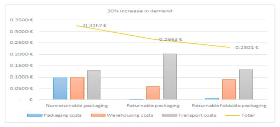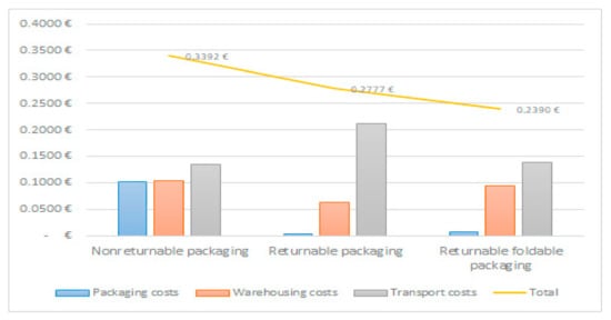 25], which came to the same conclusions. Despite the fact that the use of returnable foldable packaging is still the most cost-optimal aspect of packaging management, the cost ratio between non-returnable and returnable foldable packaging drastically decreased from 42% to 25.36% in favour of non-returnable packaging in this simulation.