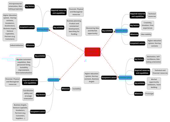Preliminary results highlighted that the analyzed startups showed similarities and differences in the way the proposed model fit their evolutionary paths. For each stage, according to the interviews, some key aspects characterizing the startup life cycle were synthesized (e.g., organizational resources, startupper competences, key entrepreneurial ecosystem actors, milestones, etc.) [63]. Figure 2 reports a summary of the results.
