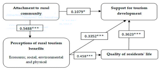 Hair, Ringle, and Sarstedt [68] indicated that, for the internal consistency reliability, composite reliability should be higher than 0.70 (although values between 0.6 and 0.7 can also be found as satisfying), while each indicator’s absolute standardized loadings should be also higher than 0.70. Following these recommendations, three items were excluded—one item from the scale “Economic benefits” (refers to creating opportunities for investments, λ = 0.3177), one from the scale “Social benefits” (contact among local residents and tourists can boost awareness that tourism development is significant for the community, λ = 0.4672), and one item from the scale “Attachment to rural community” (refers to how much local residents identify their lives with living in a particular community, λ = 0.3994). Only one item (from the scale “Social benefits”, number 5) had loadings below 0.7, but we decided to leave this item since its removal or retention did not significantly affected validity. As shown in Table 2, the scores of average variance extracted (AVE) for all variables were above 0.5, indicating that these variables were valid for further analysis.