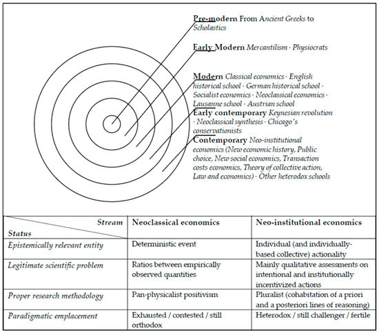 Before presenting what the European Union’s Circular Economy Package includes and discussing in detail how these regulations affect the member states (with a focus on Romania), as well as before commenting on how scholars evaluated the impact of circular economy (with a focus on recycling targets), a point is worth making. This main discussion concerns the way public regulations emerge and what has been proven so far regarding their impact on the welfare and development of a society—the undeniable goal of each and every public action. In this endeavor, we shall begin from the very basic idea that life in society (be it economic, political, etc.) is nevertheless governed by a set of rules—consecrated as “institutions”, using a more academic parlance. D.C. North, a paramount scholar in the field of institutional economics, defines institutions as “the rules of the game in a society, or more formally, are the humanly devised constraints that shape human interaction” [21]. Institutional economics, with its “law and economics” movement, gained influence in the second half of the 20th century, restructuring an unconsolidated stream of thought dating back from the late 19th century, replying also to the mechanical fictionalism that was imputed to mainstream “Keynesian-neoclassical synthesis” (for a diagrammatic glimpse, see Figure 1).