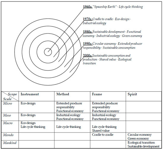 Generously and heuristically, circular economy is abundant in imagining mechanisms for implementing such ethical and efficient outcomes. For instance, some [43] plead for the so-called “cradle-to-cradle” arrangements in order to create eco-efficient (and in a sense, eco-sufficient) systems to responsibly self-sustain human cradle ecosystems—by designing endless cycles of biological and physical–chemical metabolisms. Within this representation, “waste management” (i.e., from packaging) is placed on the outer circle. Or, in another portrayal [44], the “waste hierarchy” contains layers of operations such as: prevention, reuse, recycling, energy recovery, and, only at last, disposal. The literature of circularity accommodates a progression of scientific contributions ranging from practical pragmatical instruments to philosophical principled reflections, both of these roving from single-agent-focused to whole system-oriented ones (for a diagrammatic glimpse, see Figure 2).