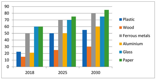 In practice, the movement towards the circular economy meant an increase in mandatory recycling target rates. Under the general umbrella of Extended Producer Responsibility (EPR), producers who place goods on the common market are required by law to recycle, by themselves or through intermediaries, a certain percentage of the quantity of their packaging. The EPR principle is the twisted European version of the “polluter pays” concept. European authorities have interpreted that the producer is always responsible for the way in which the consumer uses their products. In a sense, it is totally counterintuitive: if a person throws a used PET bottle in a lake, is the company who manufactured the bottle the one who is responsible for this? Although the EPR system is, in practice, more complicated, the general outline resides in the fact that producers have to fulfil two types of targets: the general target—i.e., a percentage of the total weight of the packaging placed on the market; and the individual targets—i.e., a percentage of the weight of each type of packaging placed on the market. The two sets of targets have to be fulfilled simultaneously. The Circular Economy Package—see Directive (EU) 2018/852 amending Directive 94/62/EC on packaging and packaging waste—imposes the increase in both types of targets by 2025 and 2030, respectively. The general target should increase from the current value of 60% to 65% in 2025 and to 70% in 2030, respectively. While this increase seems not that spectacular, if one carefully looks at the rise in individual targets for each type of packaging, the situation becomes far more interesting, as Figure 3 suggests.