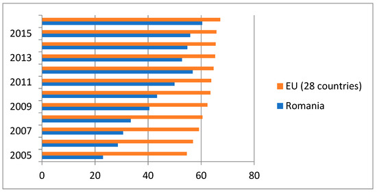 Romania’s total packaging recycling rate as compared to EU-28 (2005–2016). (Data source: Eurostat [71]).