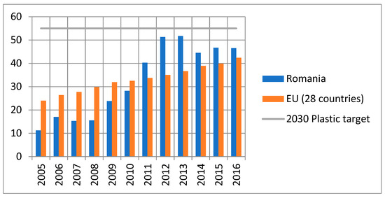 Romania’s total plastic packaging recycling rate as compared to EU-28 (2005–2016). (Data source: Eurostat [72]).