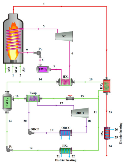 As shown, municipal solid waste is utilized as a fuel in the incinerator. The incinerator is equipped with a high-pressure steam boiler to produce steam and run the employed steam turbine. Then, the steam turbine outlet stream flows to HX1 to deliver the heat. HX1 performs as a condenser for the power cycle and as a heat source for the ORC. Then, the condensed water enters the feed water tank (FWT) to ensure any possible gas removal before being pressurized via pump (P1). The exhaust gas stream (exiting incinerator) enters a two-stage heat exchanger. Passing through the heat exchanger 1 (HX1), a heat source with great temperature is provided to support the ORC cycle for power production. The organic fluid is evaporated within the evaporator (Evap) and enters the ORC turbine (ORCT) in a saturated vapor condition. The enthalpy change of the working fluid between the turbine inlet and outlet turns into mechanical power and then the ORCT exiting flow condenses within the ORC condenser (ORCC) before being pressurized and completing the cycle. The low-temperature heat source of the ORC unit is considered as local groundwater with a temperature variety of 5–7 °C [20].