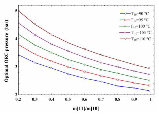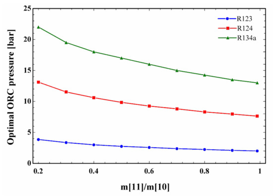 The optimal values of the ORC higher pressure in different levels of ORC supply rates (m11/m10) for various working fluids are shown in Figure 2. Note that the corresponding pressure to the maximum value of the generated power in the ORC system is determined as its optimal pressure. As can be seen from this figure, the lowest operating pressure belongs to the R123 which can be considered as an advantage for this working fluid from a turbomachinery point of view.