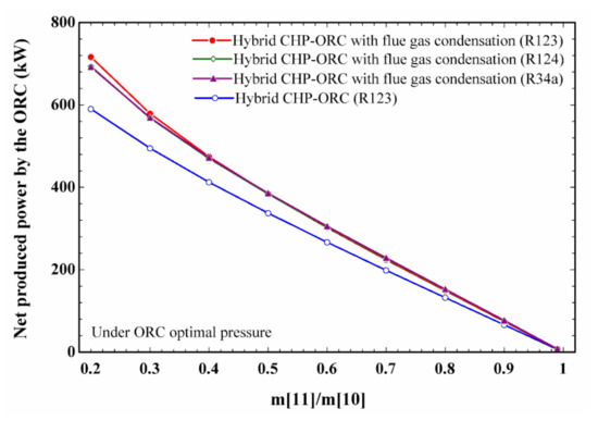 The produced power in the ORC unit with different working fluids for different amounts of m11/m10.