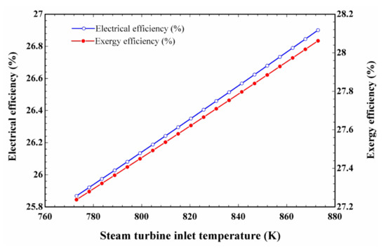 Figure 5 shows how the electrical and exergy efficiencies of the plant vary as the steam turbine inlet temperature rises. As seen, this has a direct effect on both of these parameters in an almost linear format so that when the steam turbine inlet temperature increases from 773 to 873 K (500–600 °C), the electrical and exergy efficiencies change from 25.87% to 26.9% and from 27.24% to 28.06%, respectively. In this study, however, the turbine inlet temperature of 550 °C is considered in the system modeling due to technical limitations.