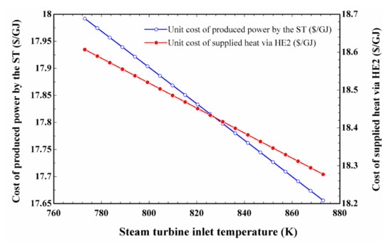 Observations confirm that growing the turbine inlet temperature in the same range as above decreases the cost of generated power in the steam turbine from USD 17.99/GJ to USD 17.66/GJ and decreases the cost of supplied heat via HX2 from USD 18.61/GJ to USD 18.28/GJ. This is shown in Figure 6.
