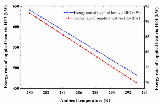 As seen in Figure 9, as the weather becomes warmer, the rate of exergy supplied via the HX2 and HX4 decreases almost linearly.