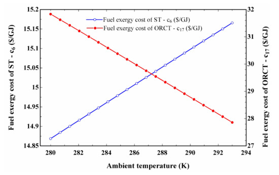Fuel exergy cost of ST and ORCT versus the ambient temperature.