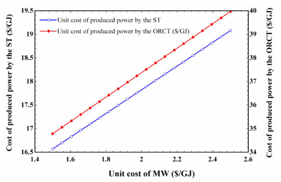 Figure 11 specifies the alteration in the cost of generating electricity by changing the unit cost of MW. As shown, increasing the unit cost of MW results in a linear growth in the cost of electricity generation via both ORCT and ST. MW is the input fuel for the whole system and a higher value for its cost will raise the cost of products. When the unit cost of MW changes from USD 1.5/GJ to USD 2.5/GJ, the cost of produced power by the ST and ORCT increases from USD 16.57/GJ to USD 19.08/GJ and from USD 34.78/GJ to USD 39.97/GJ, correspondingly. The unit cost of MW is considered to be USD 2/MJ in the modeling of this work, as stated by Jack et al. [22].