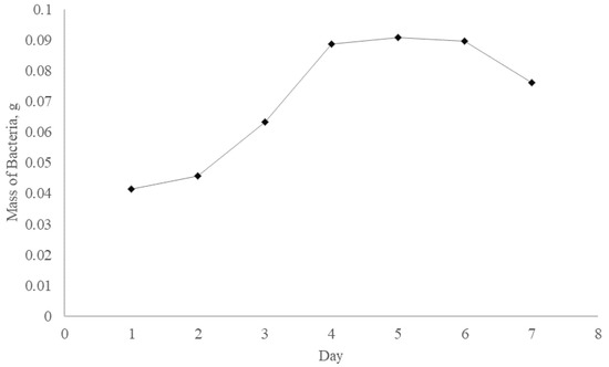 After day six, the curve showed a death phase until day seven. The death phase was marked by the accumulation of toxic substances which resulted in the decrement of bacteria mass from 0.090 g to 0.076 g. Bacteria died as many cells underwent autolysis, and most cells were lacking surrounding nutrients and facing other injurious conditions [26]. The death phase was predicted to continue after day seven.