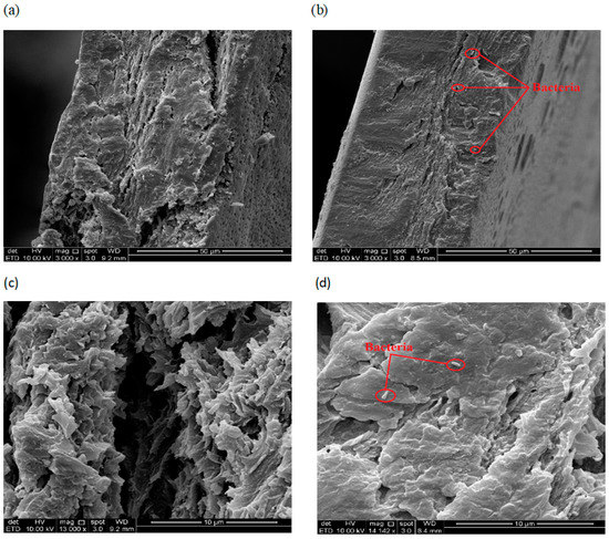 SEM micrographs, shown in Figure 3a–d revealed the comparison between the cross-sectional morphology of sodium alginate film without and with bacteria reinforcement respectively. According to Figure 1a, the film without bacteria reinforcement showed rough and uneven cross-sectional surface with visible cracking along the surface. Figure 1b demonstrated that the film which was reinforced by bacteria had become more compact with a slightly striated cross-section without noticeable cracking along the surface, typical of a stronger film with more homogenous structure.