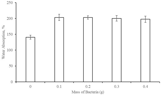 Figure 4 shows the effect of the mass of bacteria reinforcing filler on the water absorption properties of the composite films. The WAP of the film increased significantly from 140.74 ± 6.42% to 203.28 ± 10.06% for films without and with 0.1 g bacteria reinforcement, respectively, due to the absorption of water molecules by bacteria cell when the films were immersed in distilled water. Bacteria sample 4 were Gram-negative bacteria that were enveloped by an outer membrane made of lipopolysaccharide and protein [28,29,30]. Both the charged or polar hydrophilic amino acid side chains in protein molecules can attract water molecules due to hydrogen bond formation. When water molecules were attracted to the outer surface of a bacteria cell, osmosis occurred as there was different concentration gradient of water molecules between the outer and inner side of a bacteria cell. Water molecules entered the dry bacteria cell of low water molecule concentration and allowed more water molecules to be trapped in bacteria cell and absorbed as a part of the composite film.