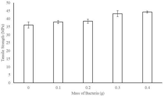 Figure 5 shows the effect of the mass of bacteria reinforcing filler on the tensile strength of the composite film. The TS of the film increased steadily from the film without bacteria reinforcement, 36.10 ± 1.94 MPa, to film with 0.4 g bacteria reinforcement, 44.29 ± 0.60 MPa. A noticeable increment of TS was observed from 0.2 g bacteria reinforcement, 38.50 ± 1.28 MPa, to 0.3 g bacteria reinforcement, 43.18 ± 1.84 MPa. The noticeable increment of TS can be explained by the presence of enough amounts of bacteria to be dispersed evenly in composite film. The results obtained showed a total increment of about 22.70% in term of TS in comparison to the film with 0.4 g of bacteria reinforcement and film without bacteria reinforcement. The enhancement of TS might be due to the hydrogen bonding which occurred between the hydroxide groups of sodium alginate components [20] and the lipopolysaccharide or protein molecules presented on the outer membrane of bacteria cells [29]. The hydroxide groups of sodium alginate were able to form hydrogen bonds with protein molecules [34,35]. The protein-alginate hydrogen bonding occurred in composite film which adjoined the bacteria and the components in the film, which strengthened the inner area of the film. The explanation was supported by the SEM micrographs shown in Figure 1, Figure 2, Figure 3 and Figure 4, as bacteria were able to reduce the voids and to close up the gap between components in the film. The higher the mass of bacteria, the bigger the surface area for interaction. Thus, more protein-alginate interaction and bonding can occur which resulted in higher TS. It is important to point out that the TS properties might be further improved through reinforcement of bacteria with mass higher than 0.4 g unless fractures occur on the films.
