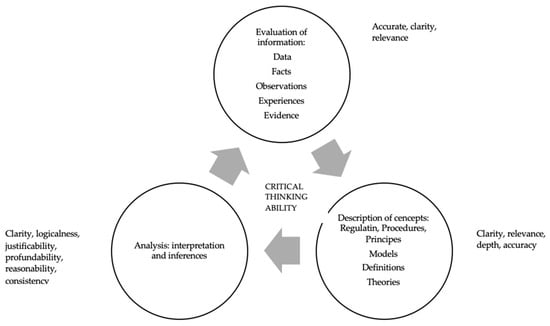 The critical thinking learning model developed and applied is described in Figure 1. Through the learning process three stages were identified: (1) Evaluation of information; (2) description/identification of problems as main concept; and (3) analysis (interpretation and inferences). The evaluation of information is based on gathering and reporting data, facts, observations, and experiences that should be clear, relevant, accurate, adequate, and consistent. The description is focused on identifying the most important concepts, theories, ideas, regulations, procedures, principles, models, and definitions that should be clear, relevant, and accurately presented. The analysis is centered on interpretation and inferences and elaborate conclusions and solutions that should be clear, logical, justifiable, and consistent. The application of the model during the learning process of FSMS (food safety management systems) to food engineering students leads to achieving the ability of critical and design thinking.