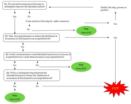 When significant hazards are identified as having HR ≥ 3, a 4Q (Questions) decision tree is used to decide whether a particular hazard is a CCP or control point (CP), analyzed in Table 5. Although it is not mandatory to use the CCP decision tree method of ISO 22000:2018, the decision tree, a clear, well-organized, and understandable visual analysis tool, should be used to determine [41] and to prioritize [42] the CCPs.